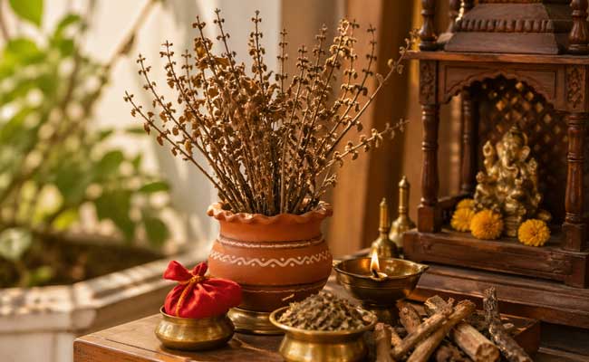 Some households place small dry Tulsi twigs near the main entrance. This is believed to help ward off negativity and welcome auspicious energy into the house.