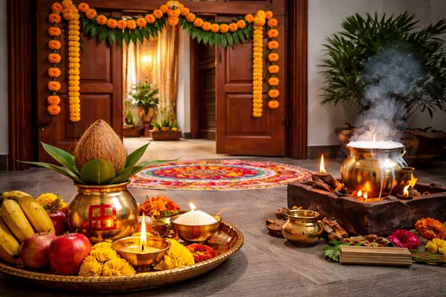 According to Vastu Shastra, certain traditional practices performed during the housewarming ceremony help create a positive environment and ensure peace, happiness, and prosperity for the family. When these customs are followed with faith and devotion, the new home is believed to become a place of comfort, stability, and growth.